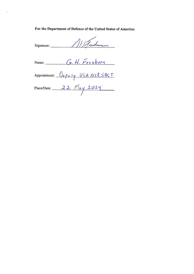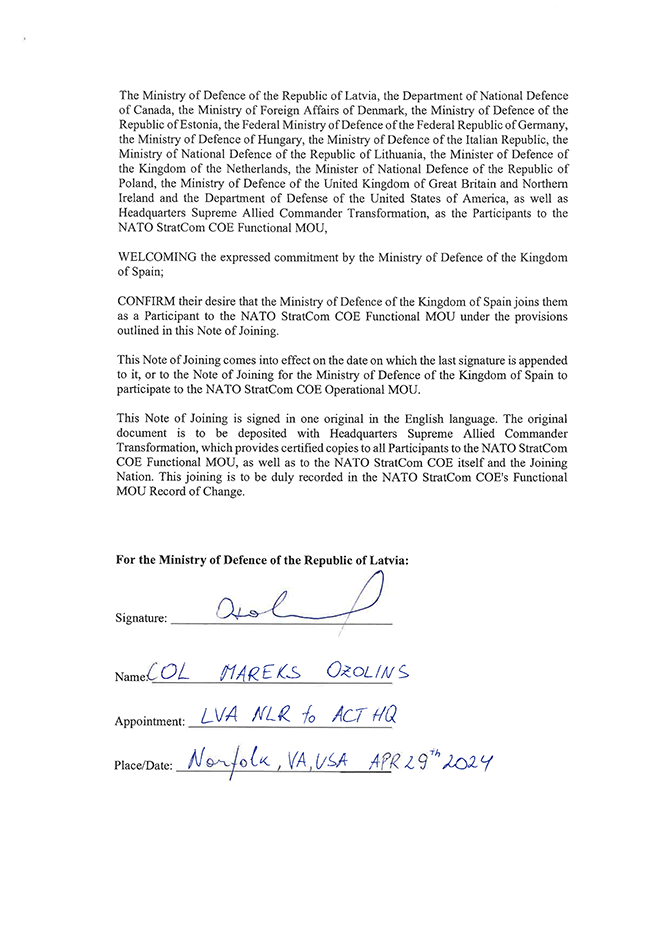Šis paziņojums par pievienošanos ir parakstīts vienā eksemplārā angļu valodā. Dokumenta oriģināls tiek deponēts pie Sabiedroto spēku Augstākās virspavēlniecības Transformācijas komandiera štāba, kas visiem MOU par NATO StratCom COE funkcijām Dalībniekiem, jaunajam Dalībniekam, NATO StratCom COE, kā arī sev izsniegs apliecinātu tā kopiju. Šī pievienošanās tiek attiecīgi reģistrēta MOU par NATO StratCom COE funkcijām Izmaiņu reģistrā.