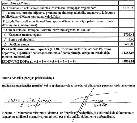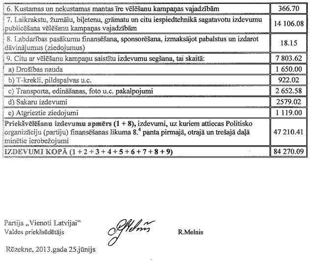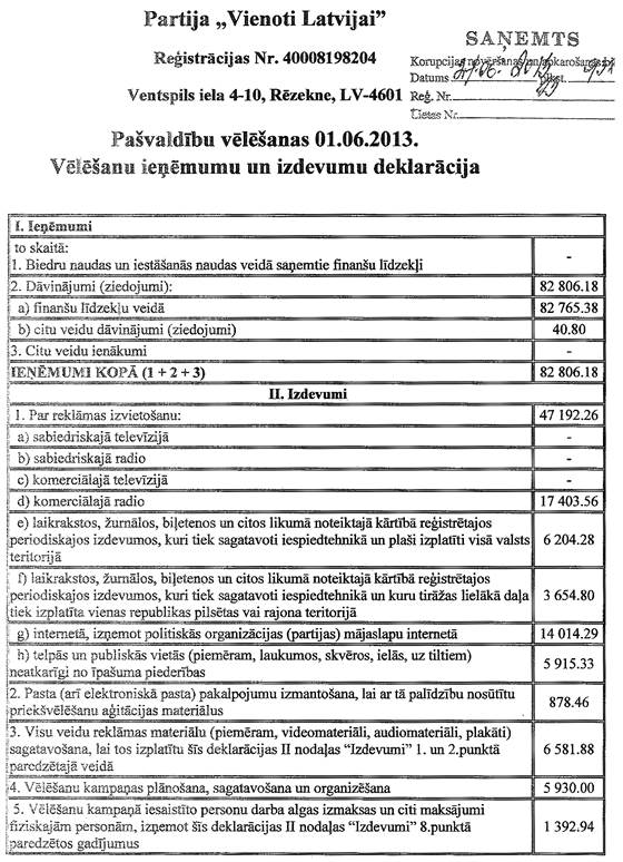 Partija "Vienoti Latvijai", reģ.Nr.40008198204, 01.06.2013. pašvaldību vēlēšanu ieņēmumu un izdevumu deklarācija