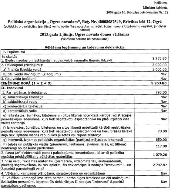 Politiskā organizācija "Ogres novadam", reģ.Nr.40008087549, 2013.gada 1.jūnija Ogres novada domes vēlēšanu ieņēmumu un izdevumu deklarācija
