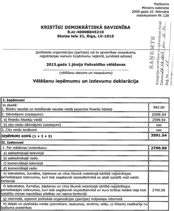 Kristīgi Demokrātiskā Savienība, reģ.Nr.40008045210, 2013.gada 1.jūnija pašvaldību vēlēšanu ieņēmumu un izdevumu deklarācija