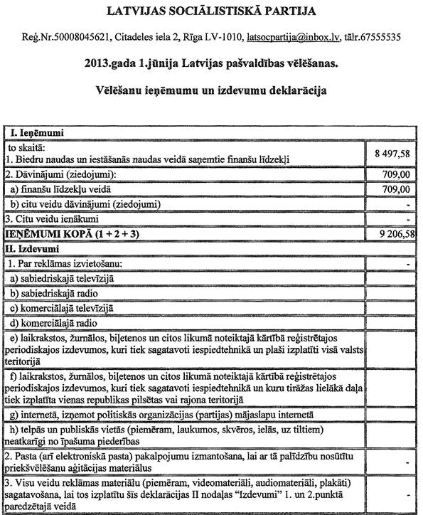 Latvijas Sociālistiskās partija, reģ.Nr.50008045621, 2013.gada 1.jūnija pašvaldību vēlēšanu ieņēmumu un izdevumu deklarācija