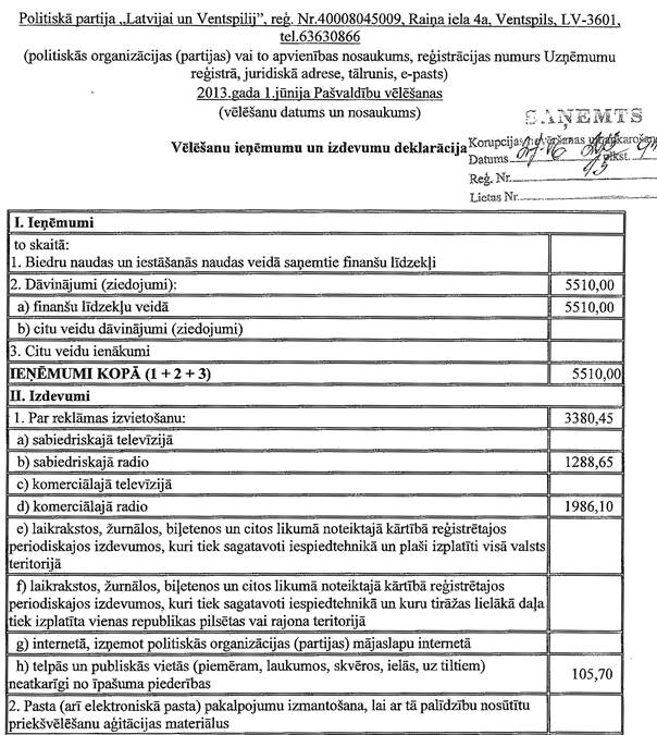 Politiskā partijas "Latvijai un Ventspilij", reģ.Nr.40008045009, 2013.gada 1.jūnija pašvaldību vēlēšanu ieņēmumu un izdevumu deklarācija