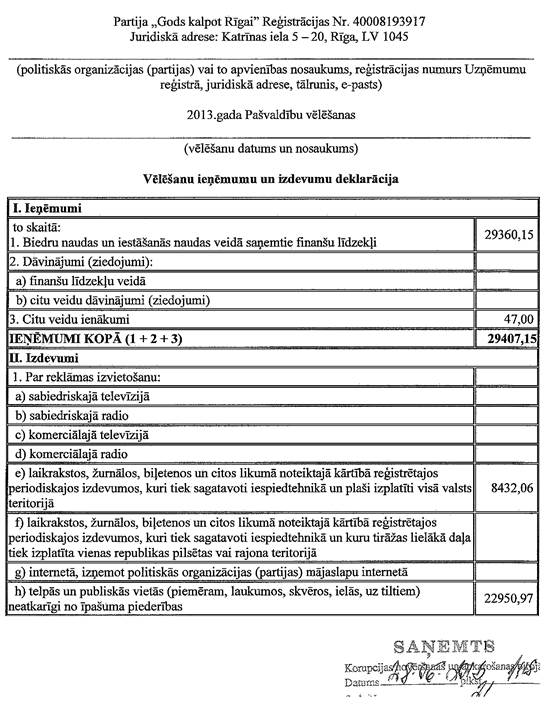 Partija "Gods kalpot Rīgai", reģ.Nr.40008193917, 2013.gada pašvaldību vēlēšanu ieņēmumu un izdevumu deklarācija