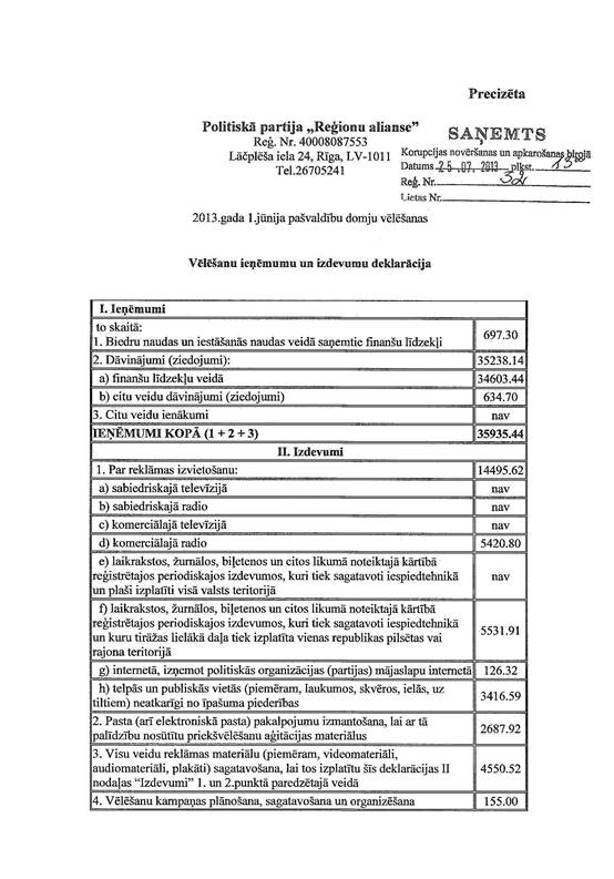 Politiskās partijas "Reģionu Alianse" 2013.gada 1.jūnija pašvaldību vēlēšanu ieņēmumu un izdevumu deklarācija
