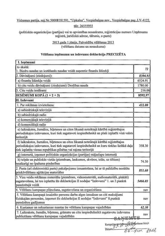 Politiskās partijas "Vidzemes partija" precizētā 2013.gada 1.jūnija pašvaldību vēlēšanu ieņēmumu un izdevumu deklarācija