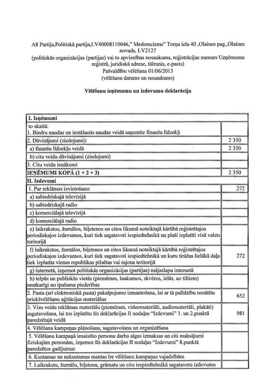 Politiskās partijas "A8 partija" 2013.gada 1.jūnija pašvaldību vēlēšanu ieņēmumu un izdevumu deklarācija