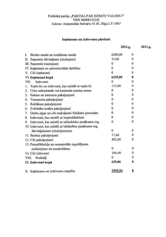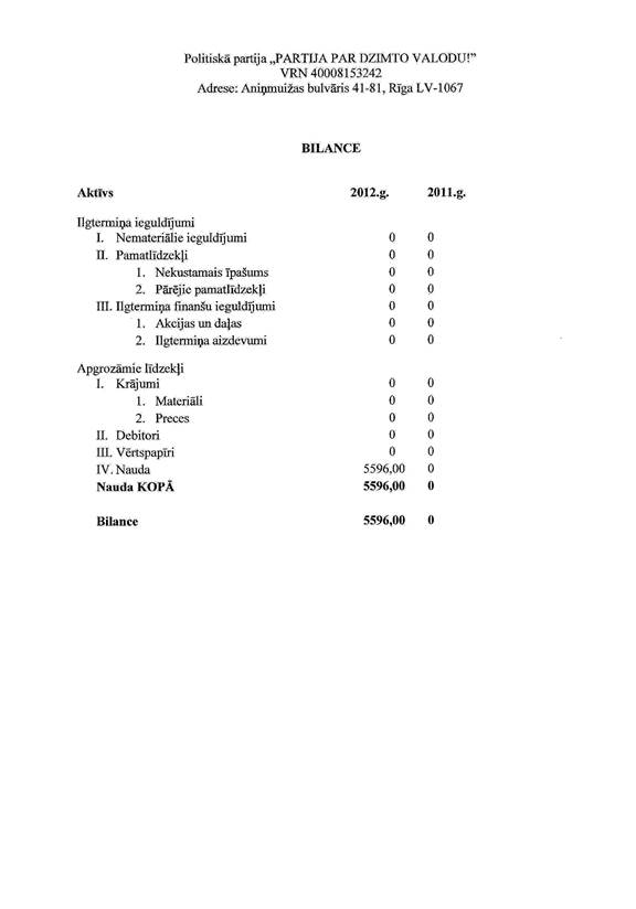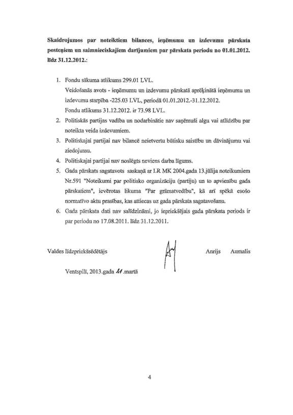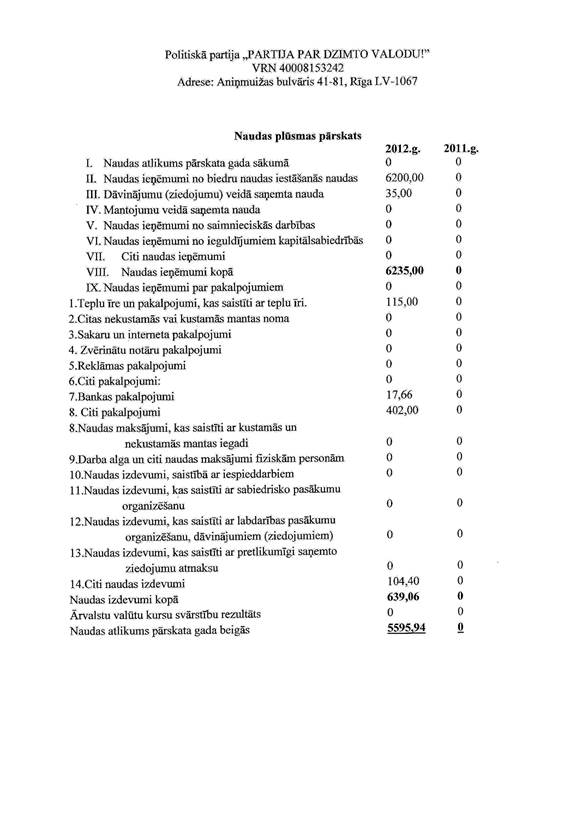 Politiskās partijas "Rīcības partija" 2012.gada pārskats