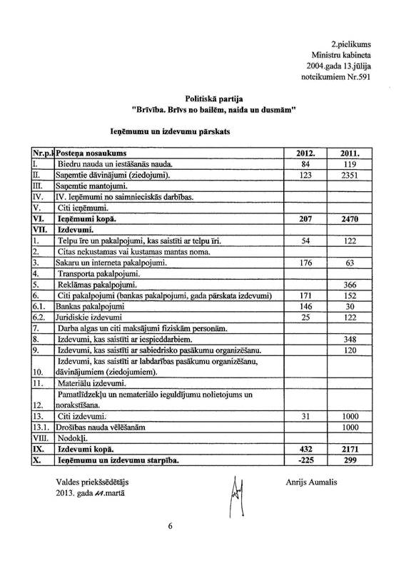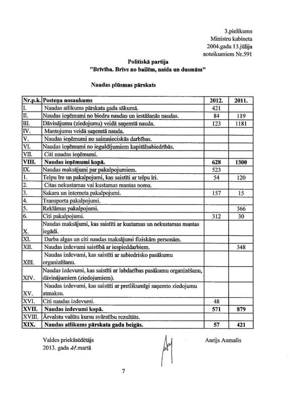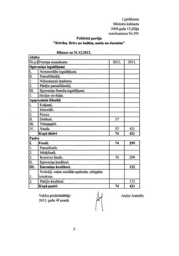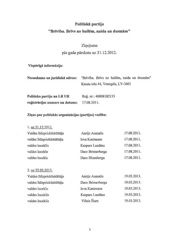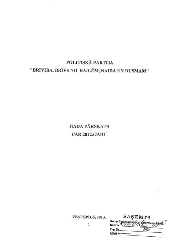 Politiskās partijas "Brīvība. Brīvs no bailēm, naida un dusmām" gada pārskats par 2012.gadu