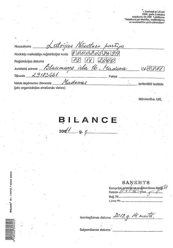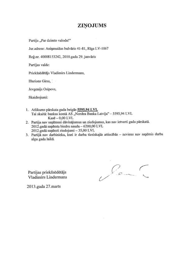 Politiskās partijas "Pēdējā partija" bilance par 2012.gadu