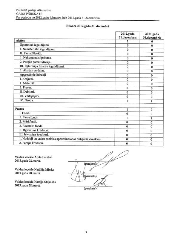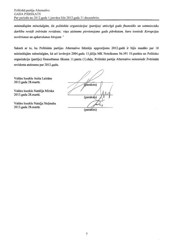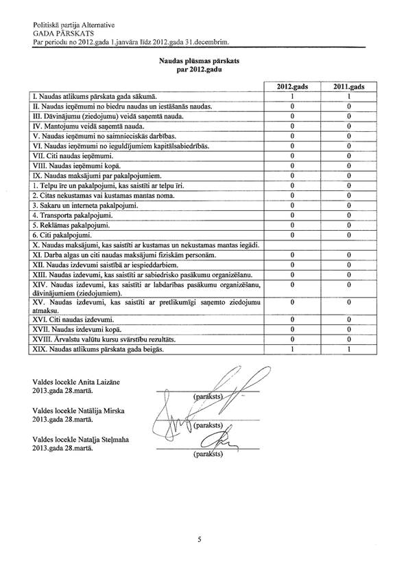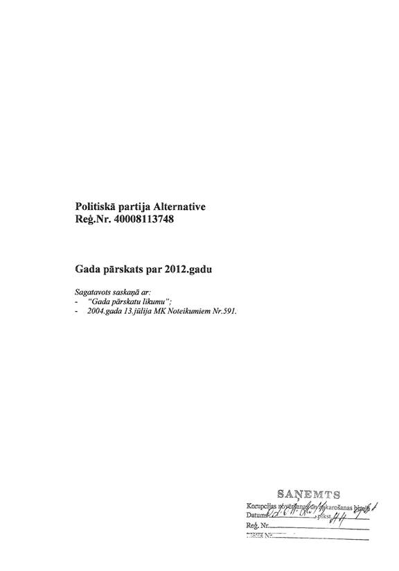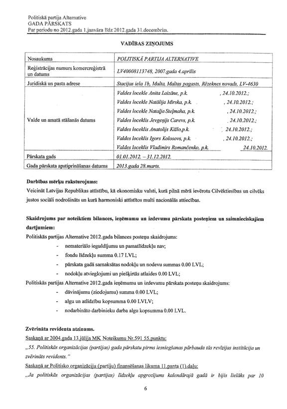Politiskās partijas Alternative gada pārskats par 2012.gadu