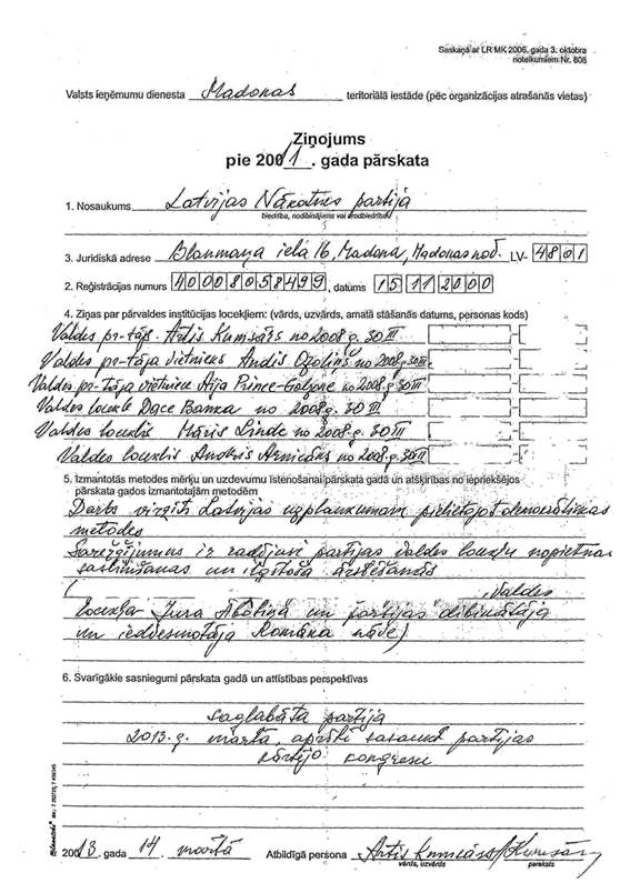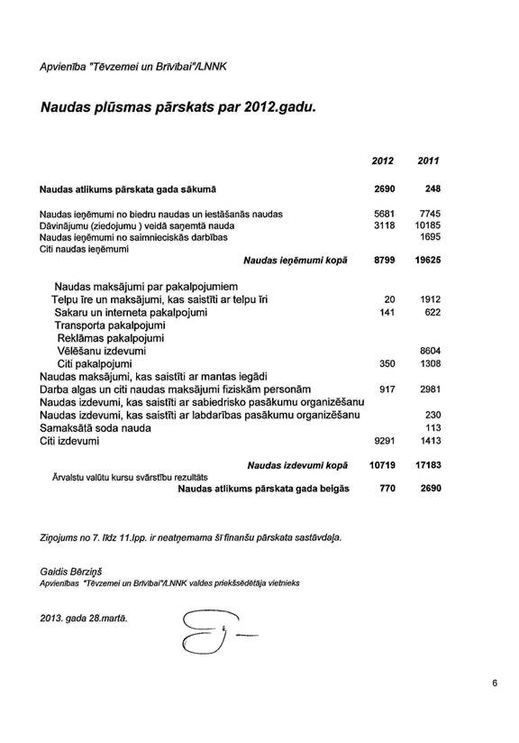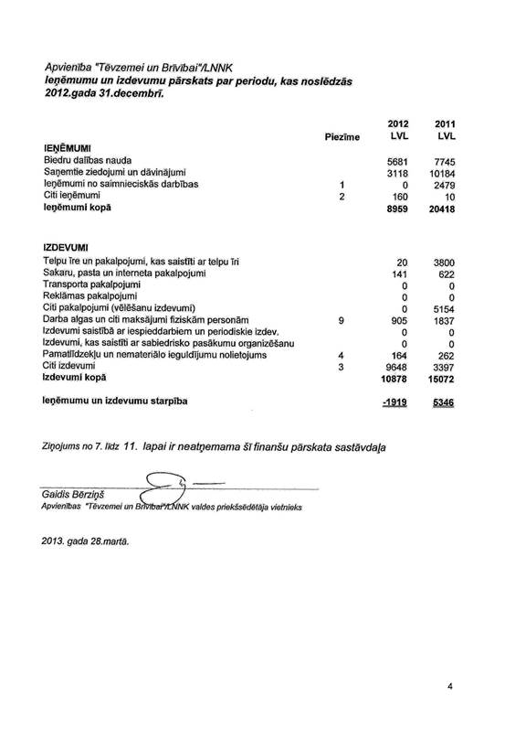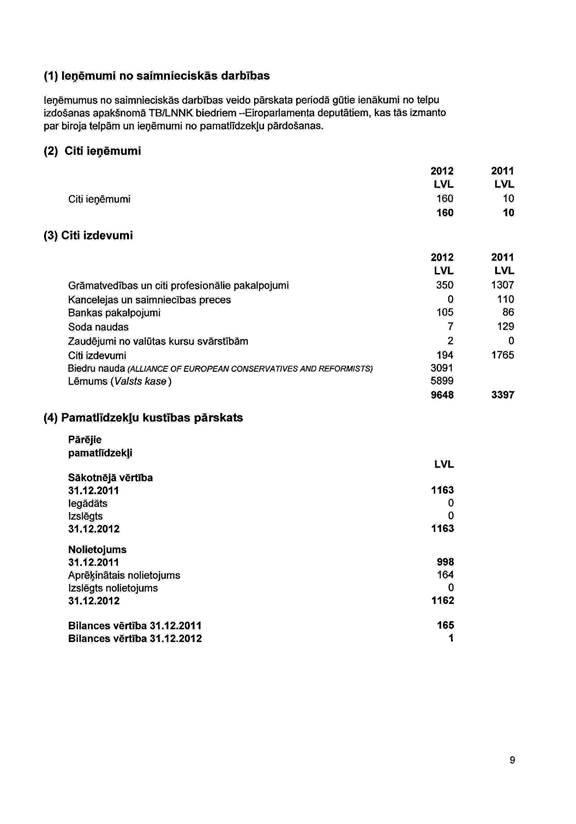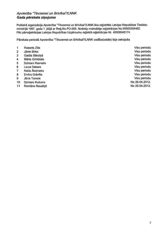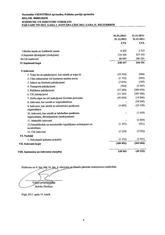 Nacionālās apvienības "Visu Latvijai!" - "Tēvzemei un Brīvībai/LNNK" 2012.gada pārskats