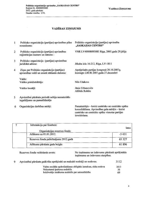 Politisko organizāciju apvienības "Saskaņas centrs" gada pārskats par 2012.gadu
