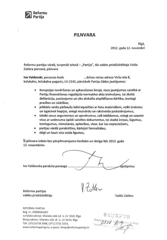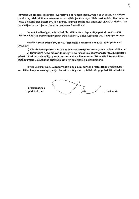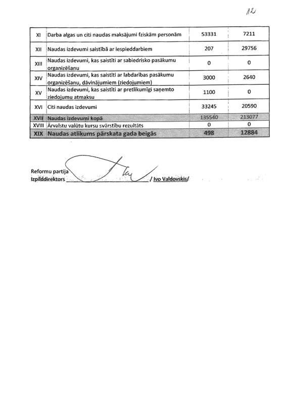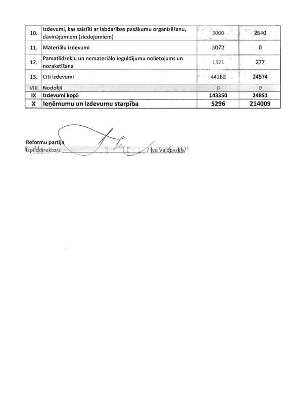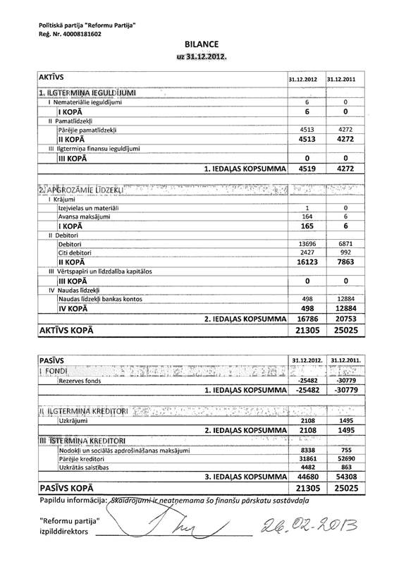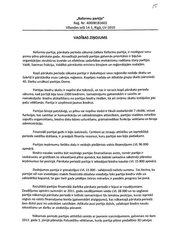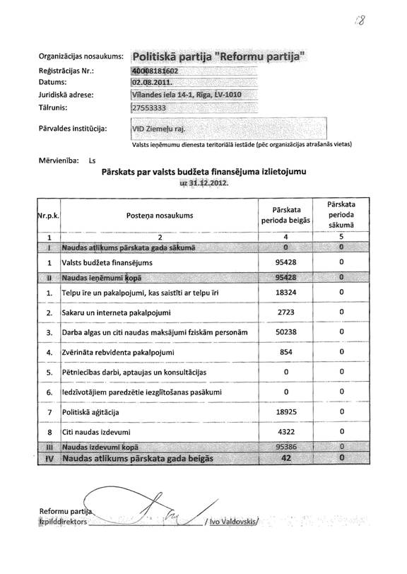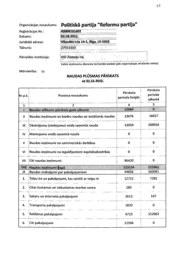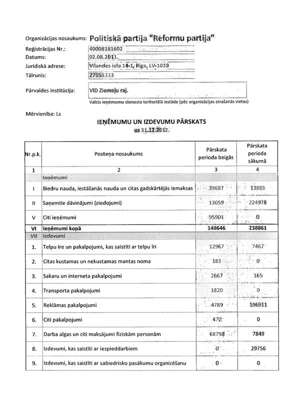 Politiskās partijas "Reformu partija" 2012.gada pārskats