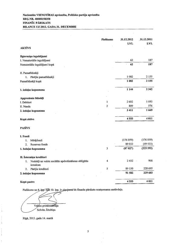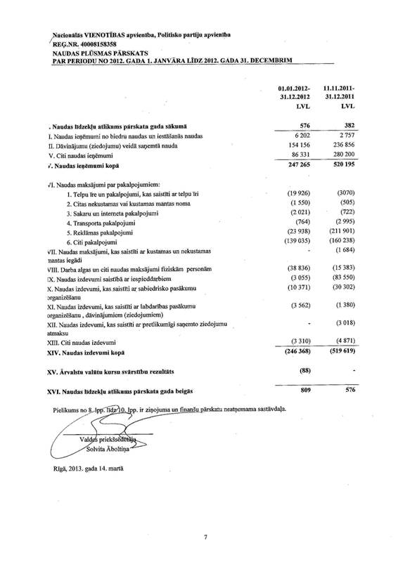 Partijas "Vienotība" gada pārskats par 2012.gadu