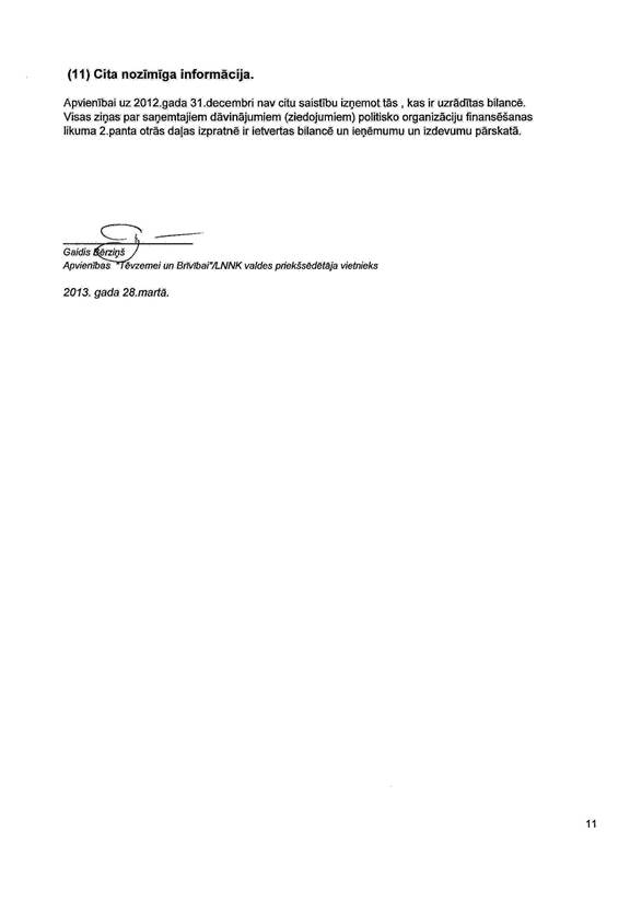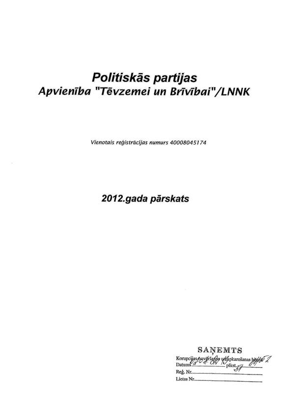 Politiskās partijas Apvienība "Tēvzemei un Brīvībai"/LNNK 2012.gada pārskats