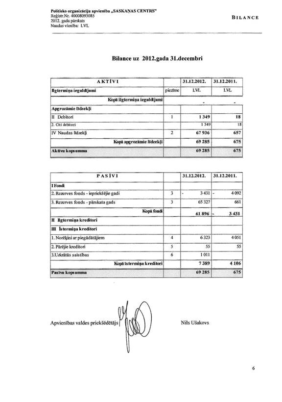 Politiskās organizācijas Sociāldemokrātiska politisko partiju apvienība "Atbildība" 2012.gada pārskats