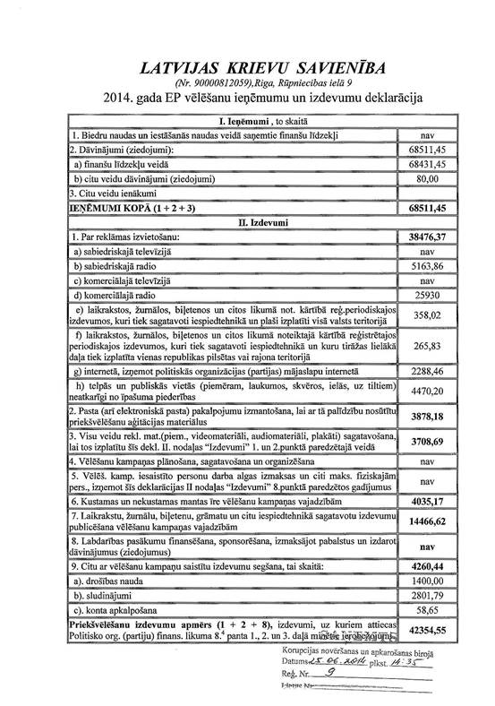 Politiskās partijas "Latvijas Krievu savienība", reģ.Nr.90000812059, 2014.gada 24.maija Eiropas Parlamenta vēlēšanu ieņēmumu un izdevumu deklarācija