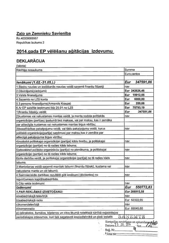 Politisko partiju apvienības "Zaļo un Zemnieku savienība", reģ.Nr.40008068957, precizētā 2014.gada 24.maija Eiropas Parlamenta vēlēšanu ieņēmumu un izdevumu deklarācija