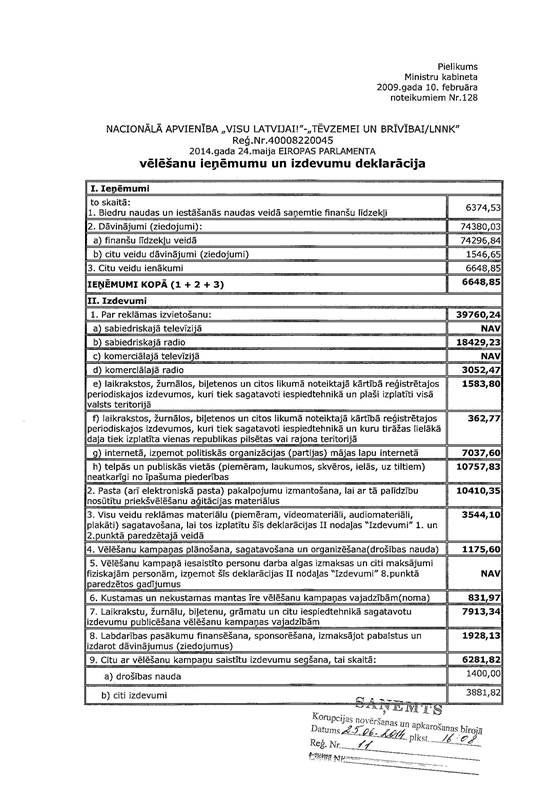 Politiskās partijas "Nacionālā apvienība "Visu Latvijai!" - "Tēvzemei un Brīvībai/LNNK"", reģ.Nr.40008220045, 2014.gada 24.maija Eiropas Parlamenta vēlēšanu ieņēmumu un izdevumu deklarācija