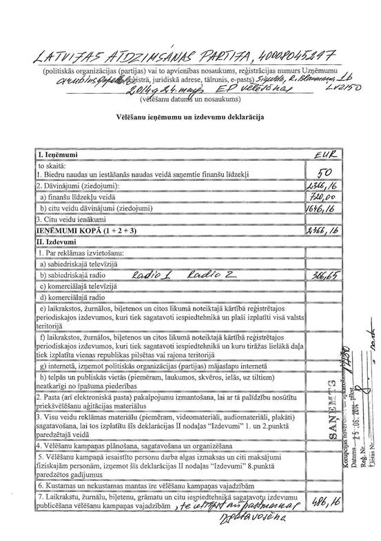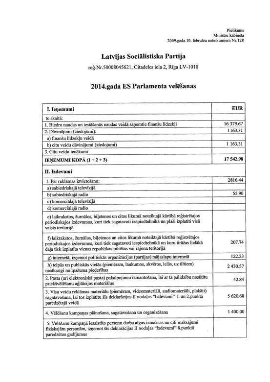 Politiskās partijas "Latvijas Sociālistiskā partija", reģ.Nr.50008045621, 2014.gada 24.maija Eiropas Parlamenta vēlēšanu ieņēmumu un izdevumu deklarācija
