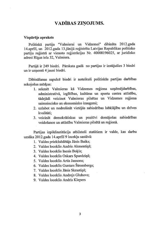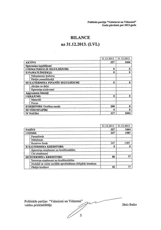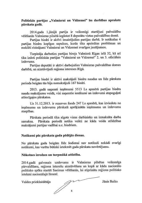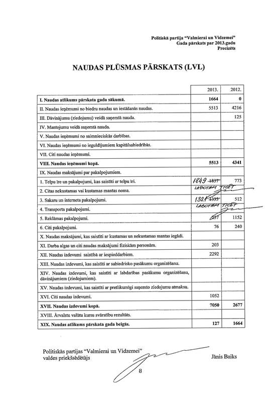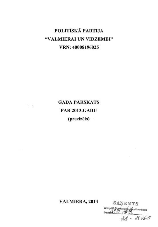 Politiskās partijas "Valmierai un Vidzemei", reģ. Nr. 40008196025, 2014.gada 24.jūlijā iesniegtais precizētais gada pārskats par 2013.gadu