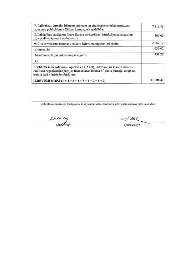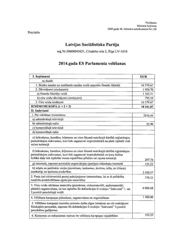Politiskās partijas "Latvijas Sociālistiskā partija", reģ. Nr. 50008045621, precizēta 2014. gada Eiropas Parlamenta vēlēšanu ieņēmumu un izdevumu deklarācija