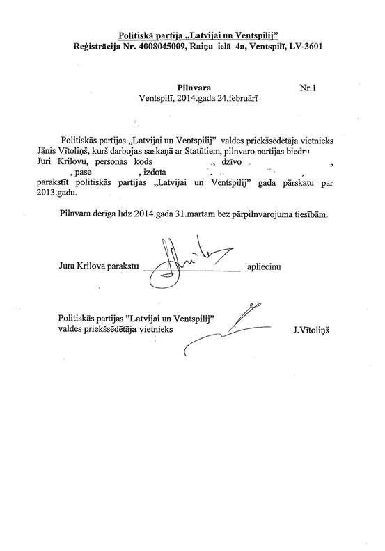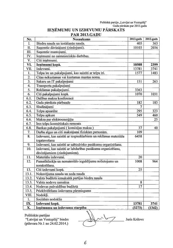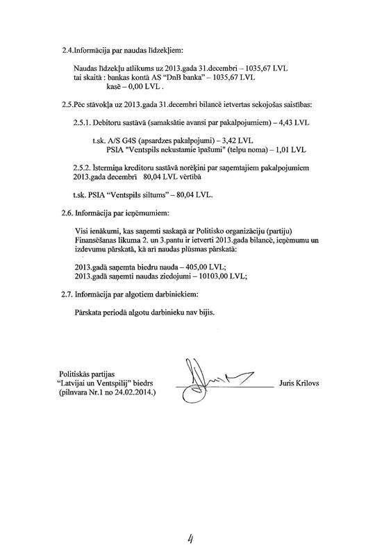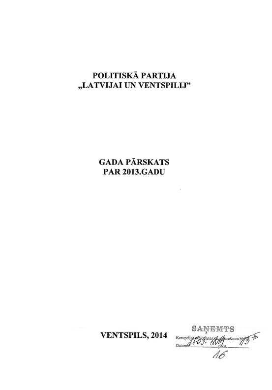 Politiskās partijas "Latvijai un Ventspilij", reģ.Nr.40008045009, gada pārskats 2013.gadu
