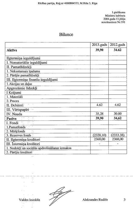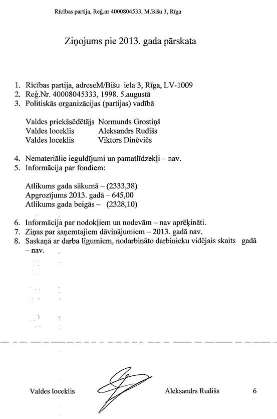 Politiskās partijas "Rīcības partija", reģ. Nr. 40008045333, gada pārskats par 2013.gadu
