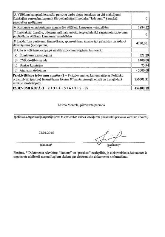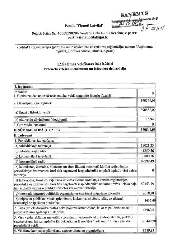 Politiskās partijas "Partija "Vienoti Latvijai"", reģ. Nr. 40008198204, precizēta 2014.gada 12.Saeimas vēlēšanu ieņēmumu un izdevumu deklarācija
