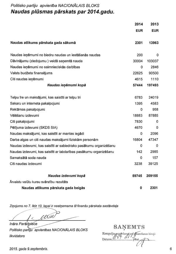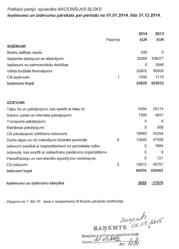 Politisko partiju apvienības "Nacionālais bloks", reģ.Nr.40008162620, precizēts gada pārskats par 2014.gadu