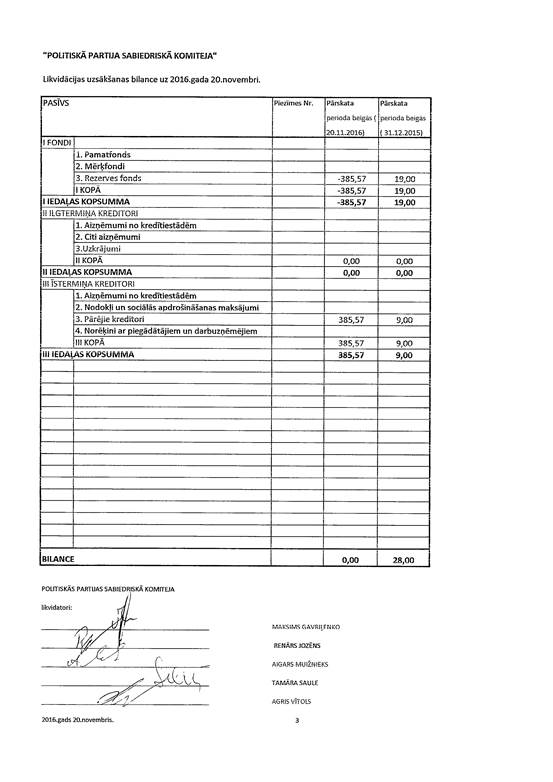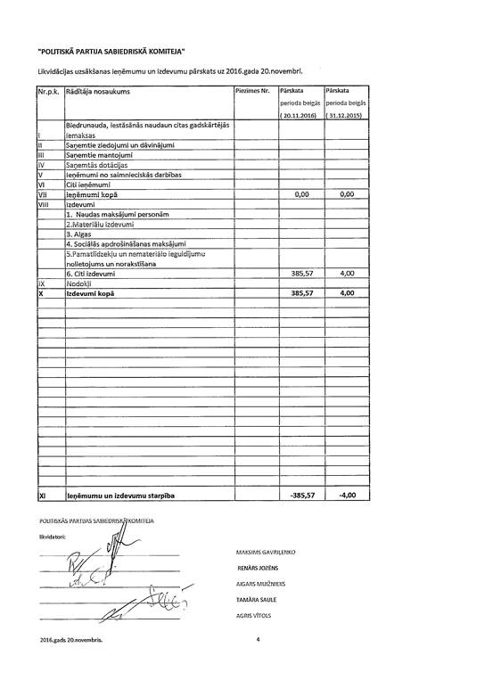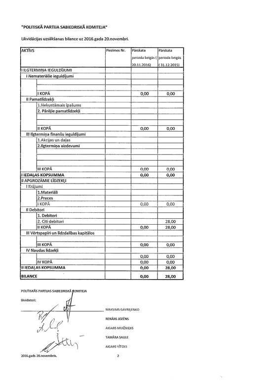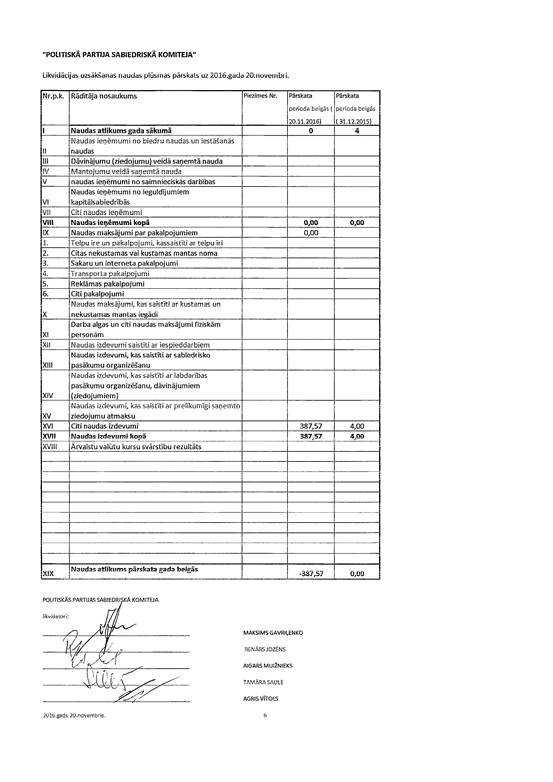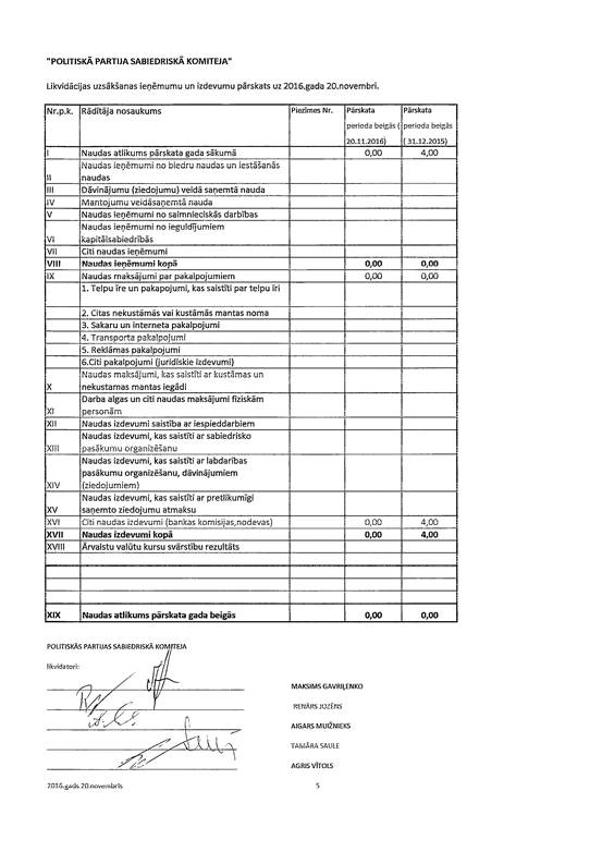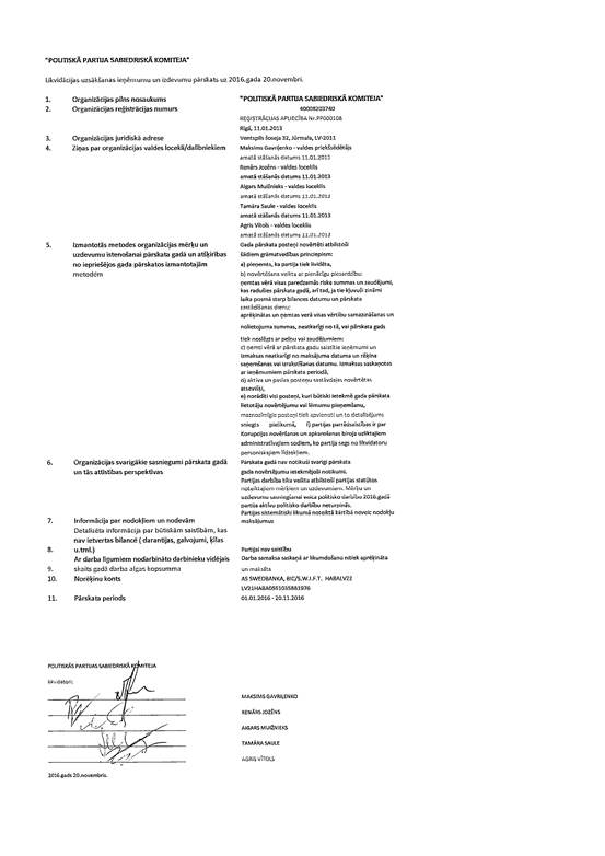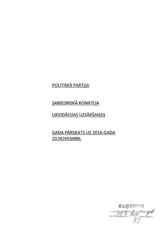 Politiskās partijas "Sabiedriskā Komiteja", reģ. Nr. 40008203740, likvidācijas uzsākšanas gada pārskats par 2016. gadu