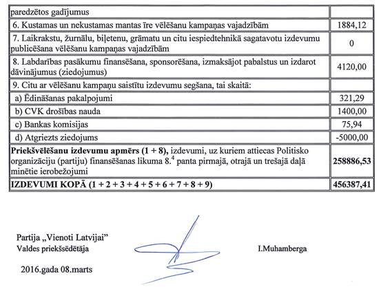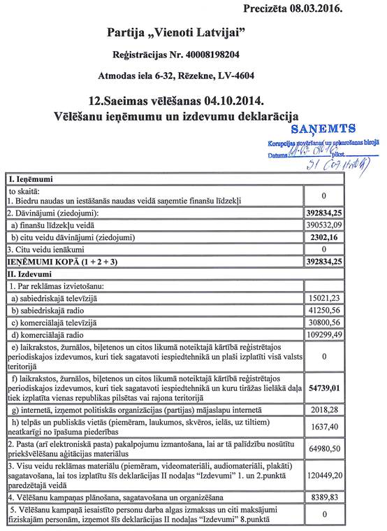 Politiskās partijas "Partija "Vienoti Latvijai"", reģ. Nr. 40008198204, precizēta 12. Saeimas vēlēšanu ieņēmumu un izdevumu deklarācija