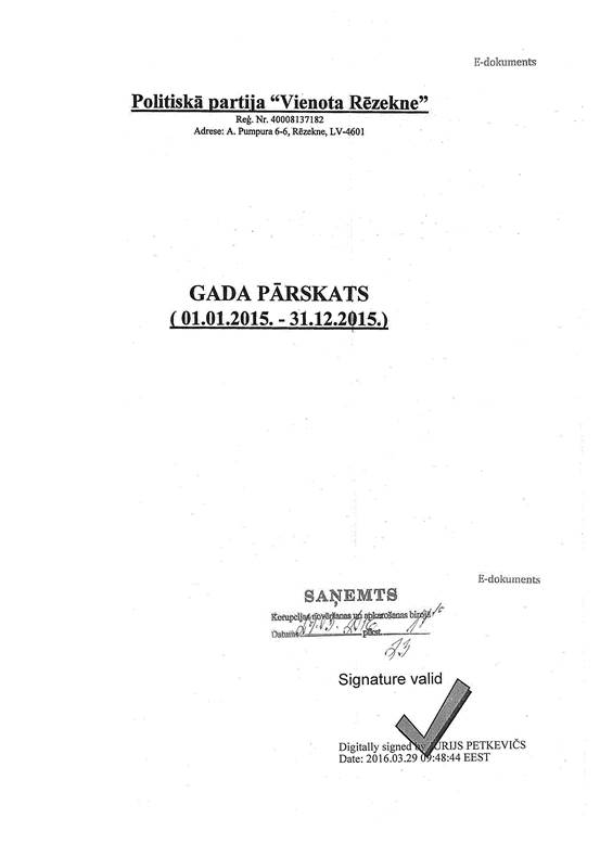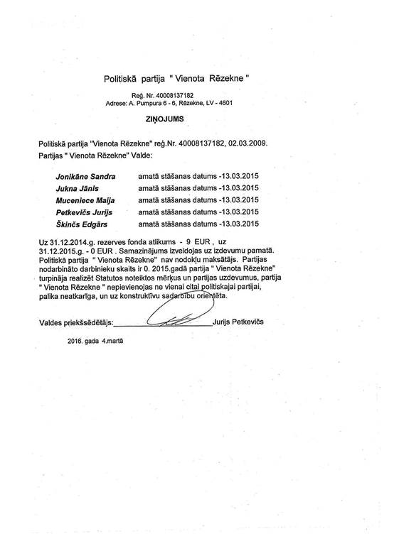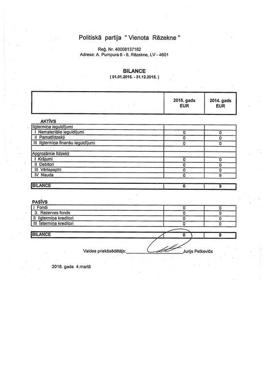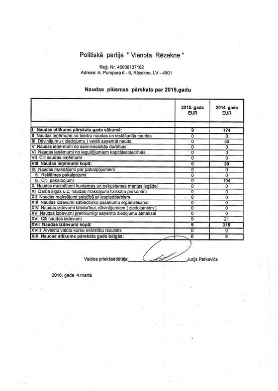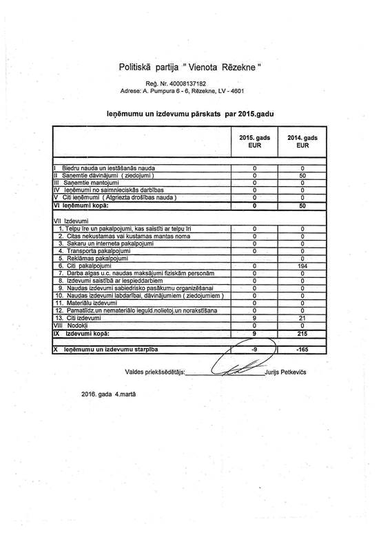 Politiskās partijas "Vienota Rēzekne", reģ. Nr. 40008137182, gada pārskats par 2015.gadu