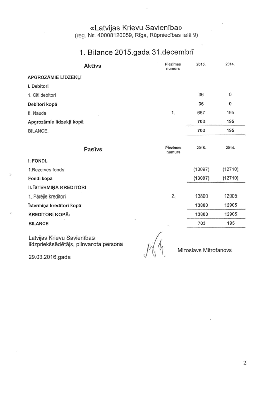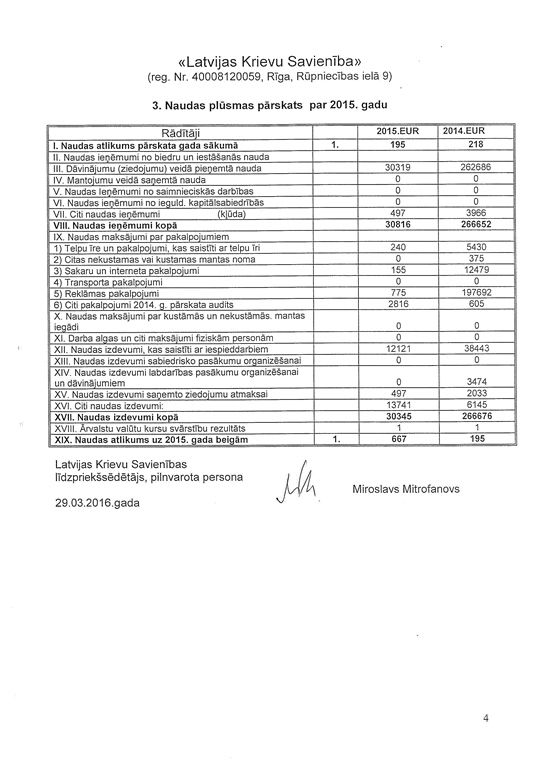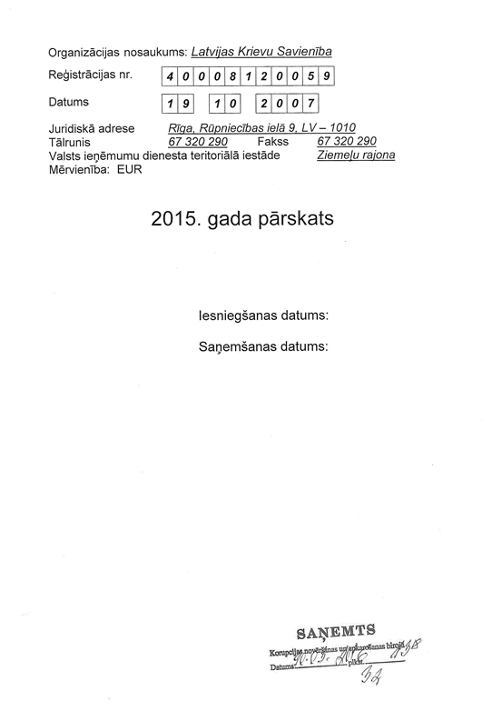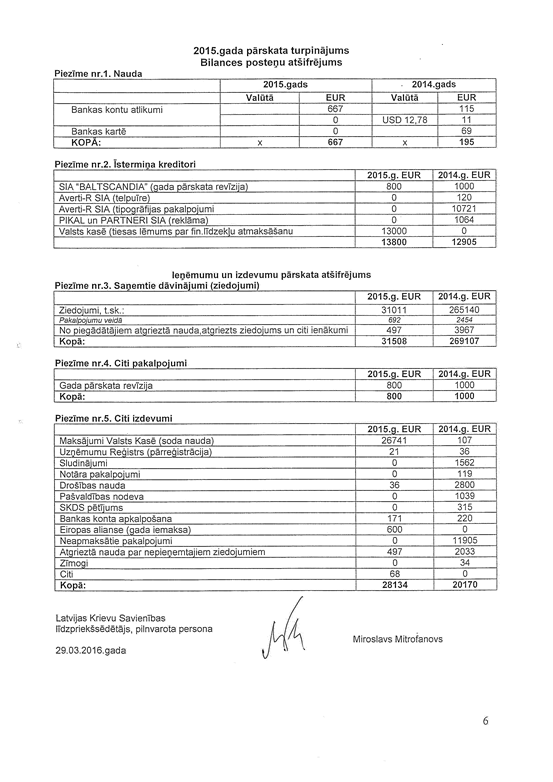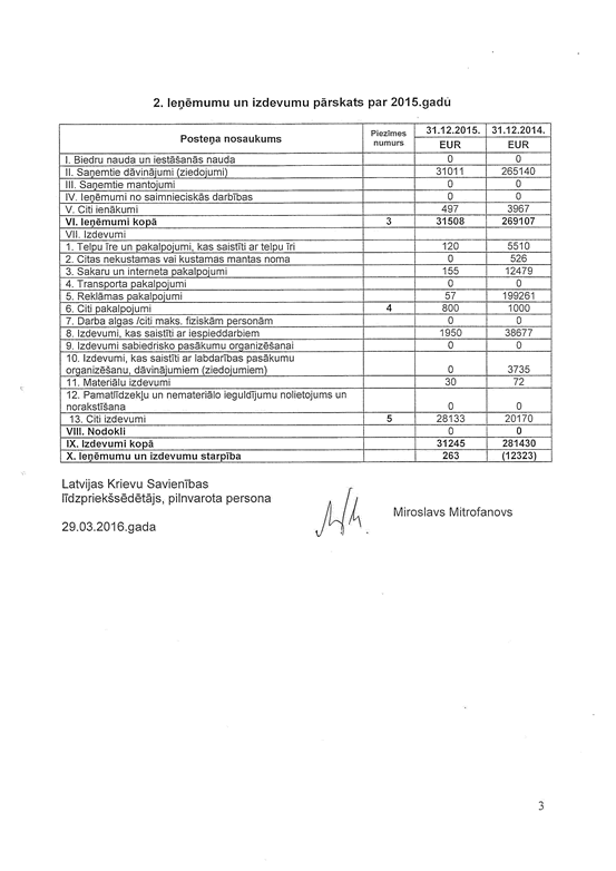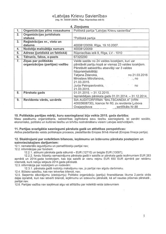 Politiskās partijas "Latvijas Krievu savienība", reģ. Nr. 40008120059, gada pārskats par 2015.gadu