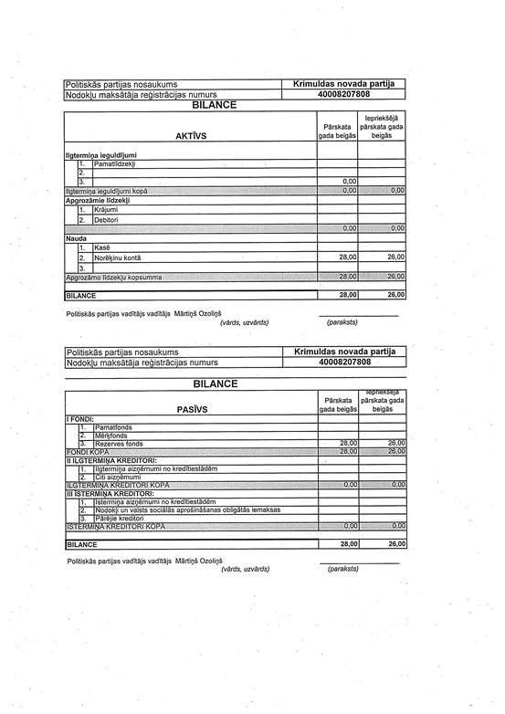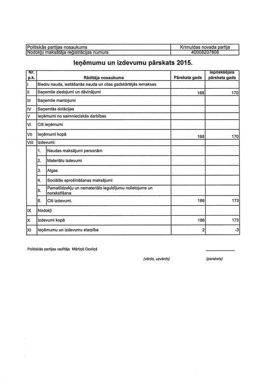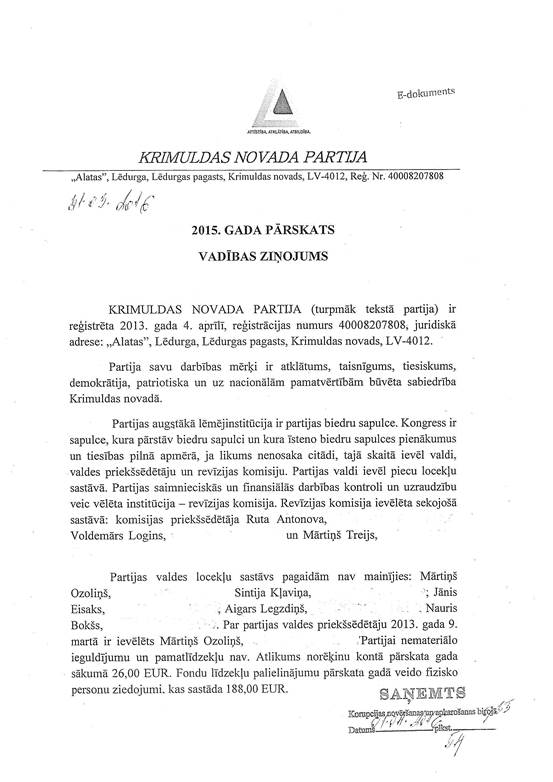 Politiskās partijas "KRIMULDAS NOVADA PARTIJA", reģ. Nr. 40008207808, gada pārskats par 2015. gadu