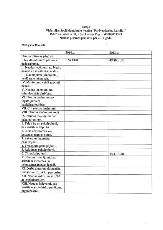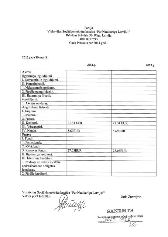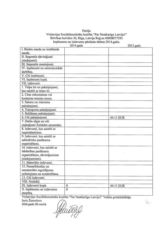 Politiskās partijas "Vislatvijas Sociāldemokrātu kustība "Par Neatkarīgu Latviju!"", reģ. Nr. 40008077593, gada pārskats par 2014. gadu
