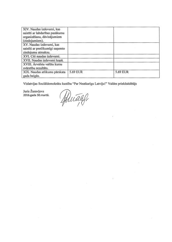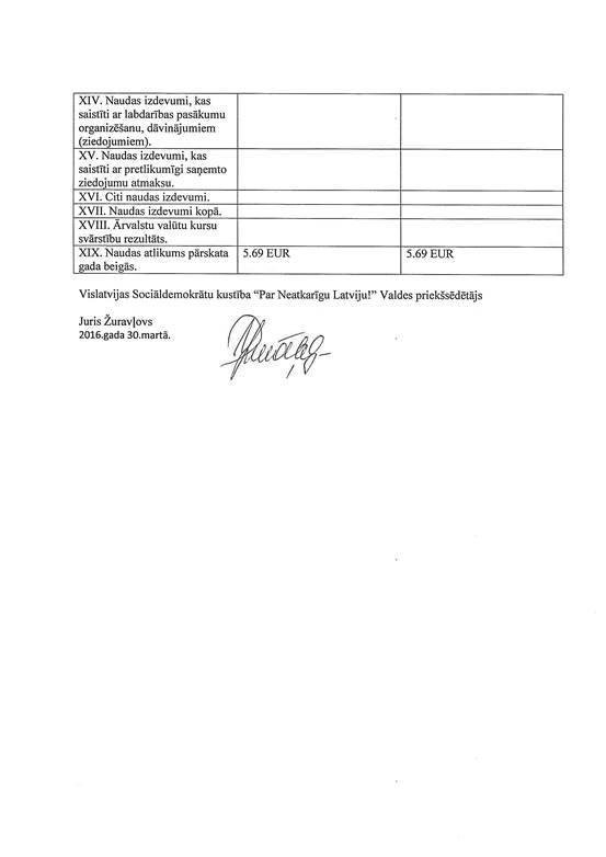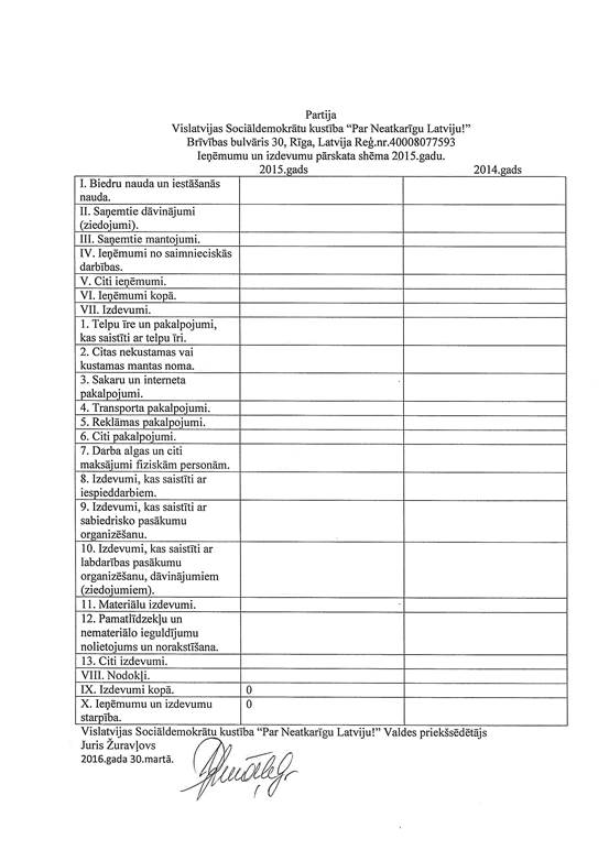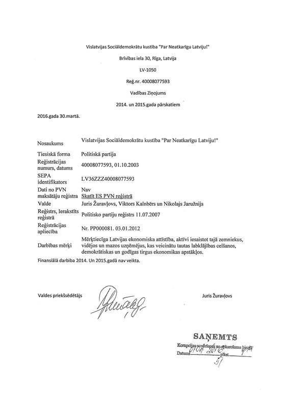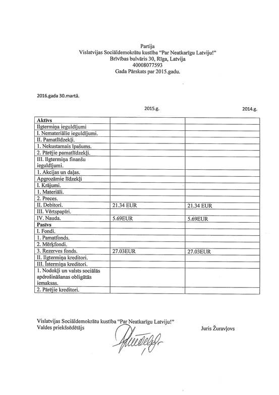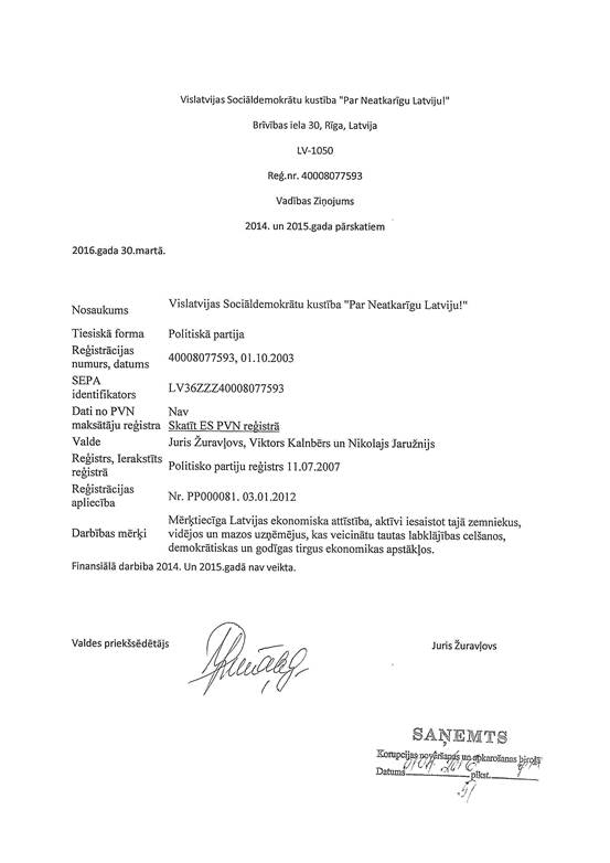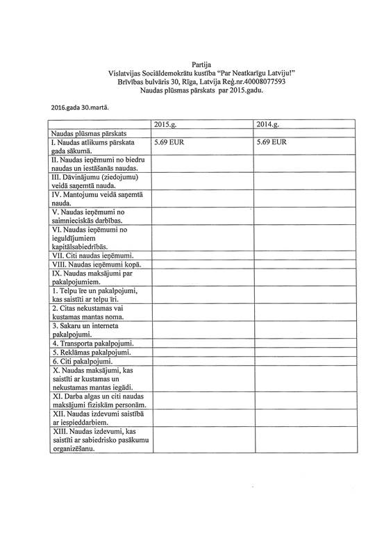 Politiskās partijas "Vislatvijas Sociāldemokrātu kustība "Par Neatkarīgu Latviju!"", reģ. Nr. 40008077593, gada pārskats par 2015. gadu