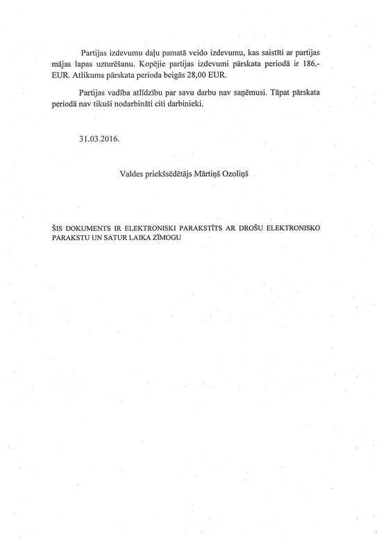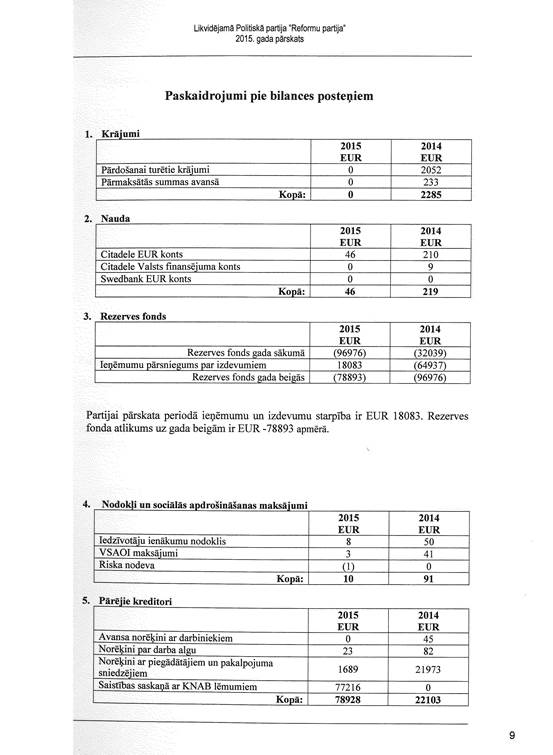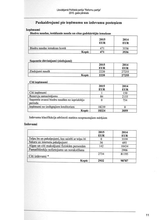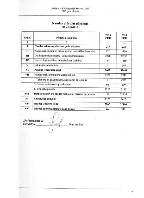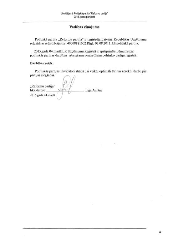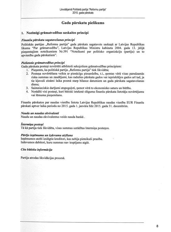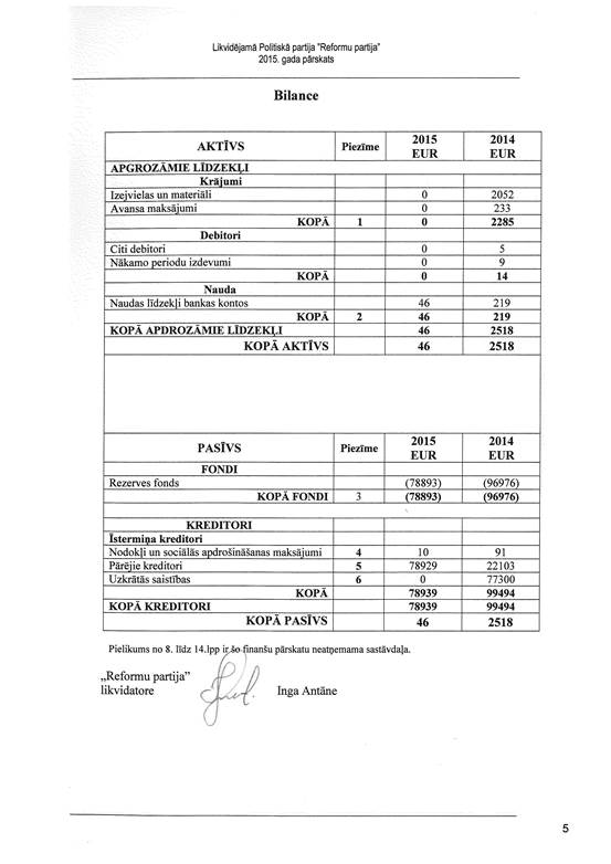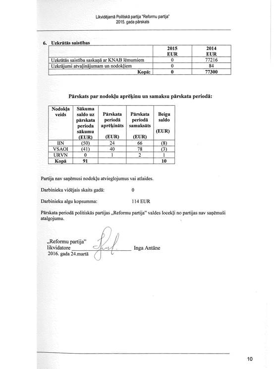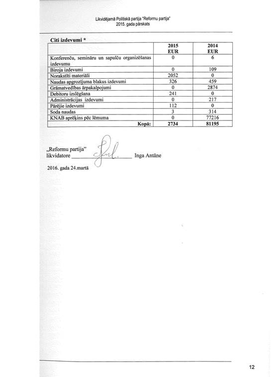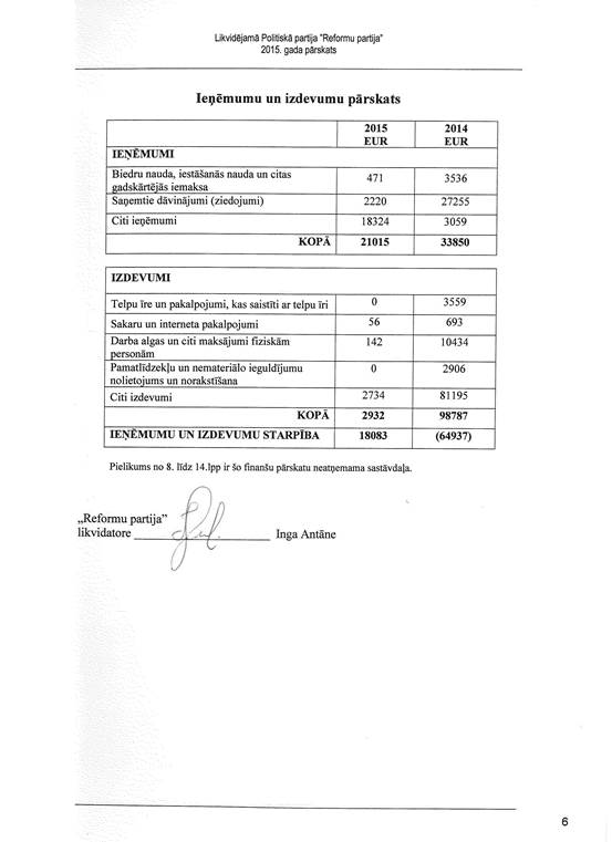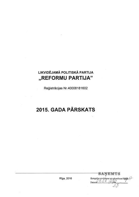 Likvidējamās politiskās partijas "Reformu partija", reģ. Nr. 40008181602, gada pārskats par 2015. gadu