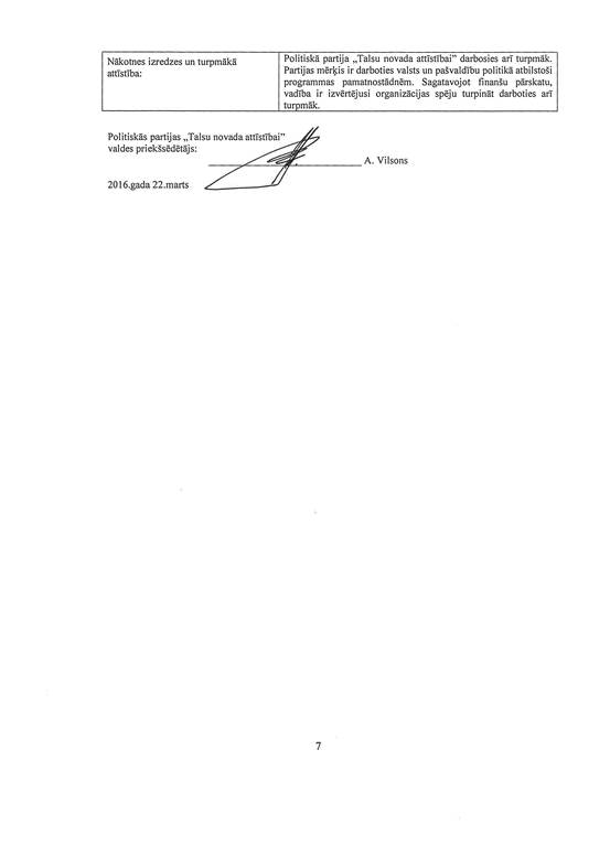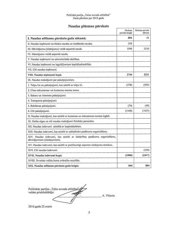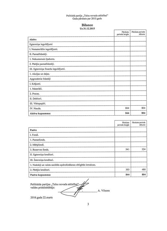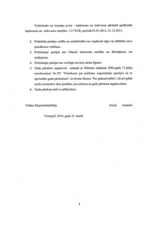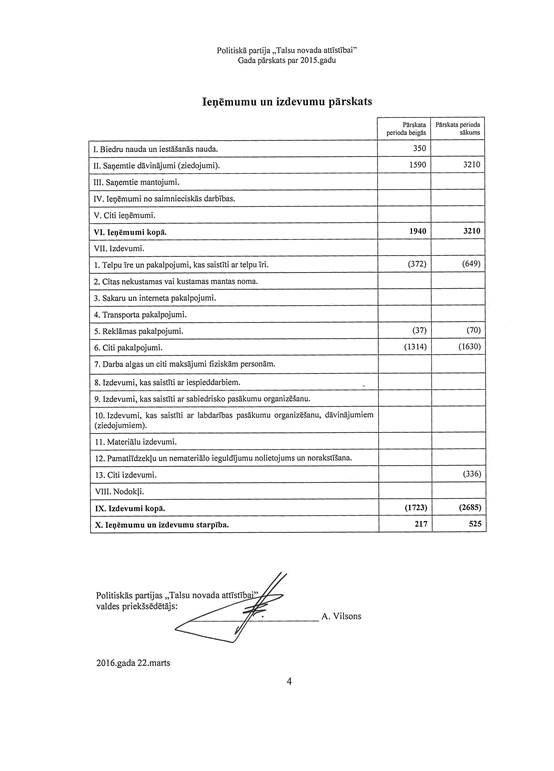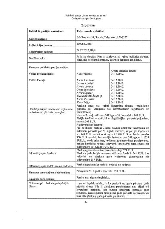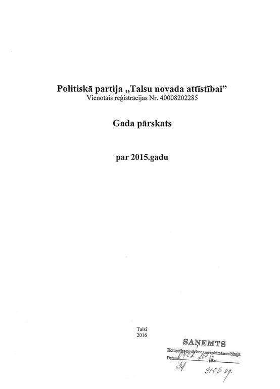 Politiskās partijas "Talsu novada attīstībai", reģ. Nr. 40008202285, gada pārskats par 2015. gadu