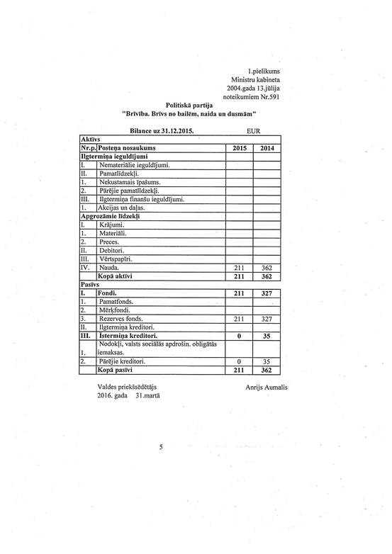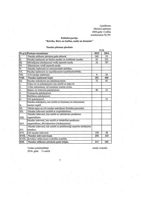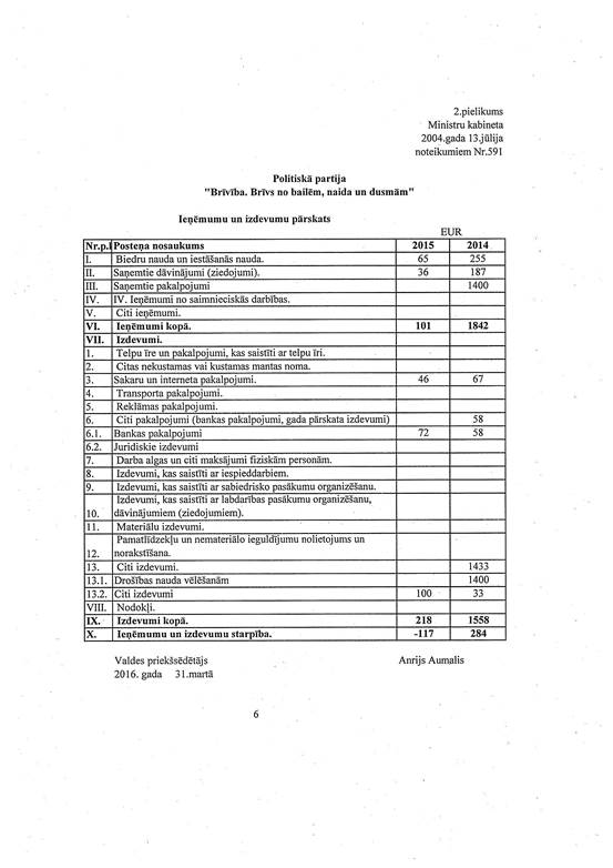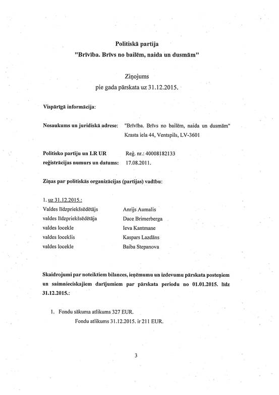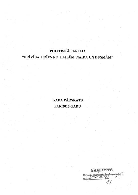 Politiskās partijas "Brīvība. Brīvs no bailēm, naida un dusmām", reģ. Nr. 40008182133, gada pārskats par 2015. gadu