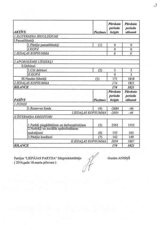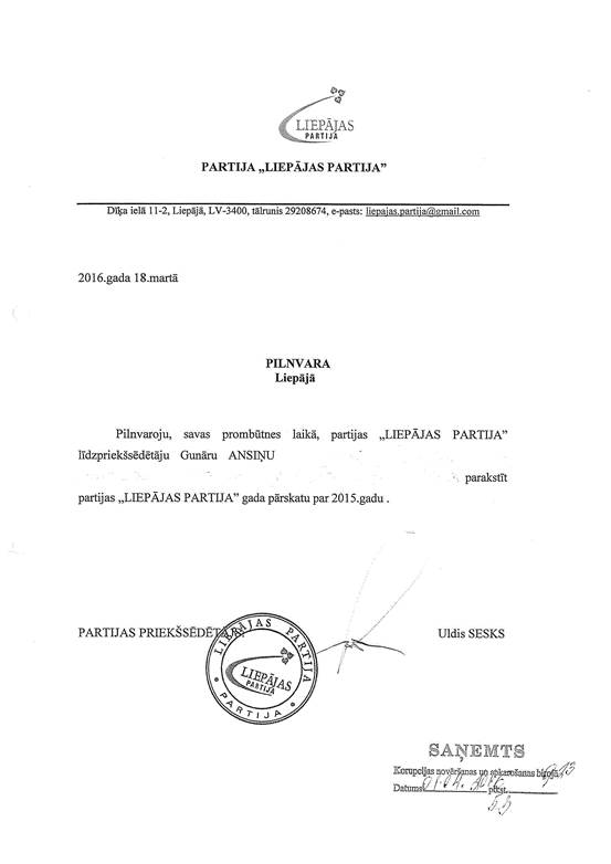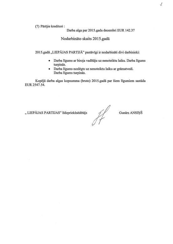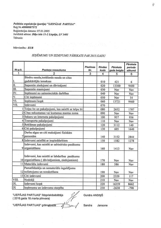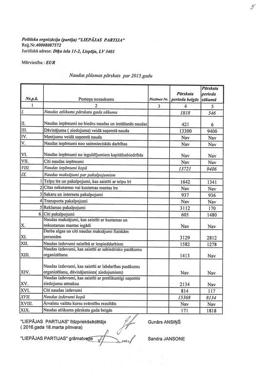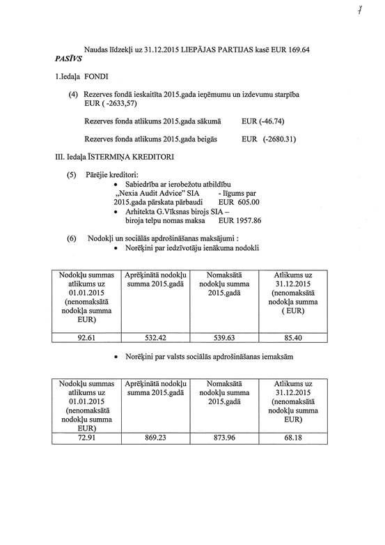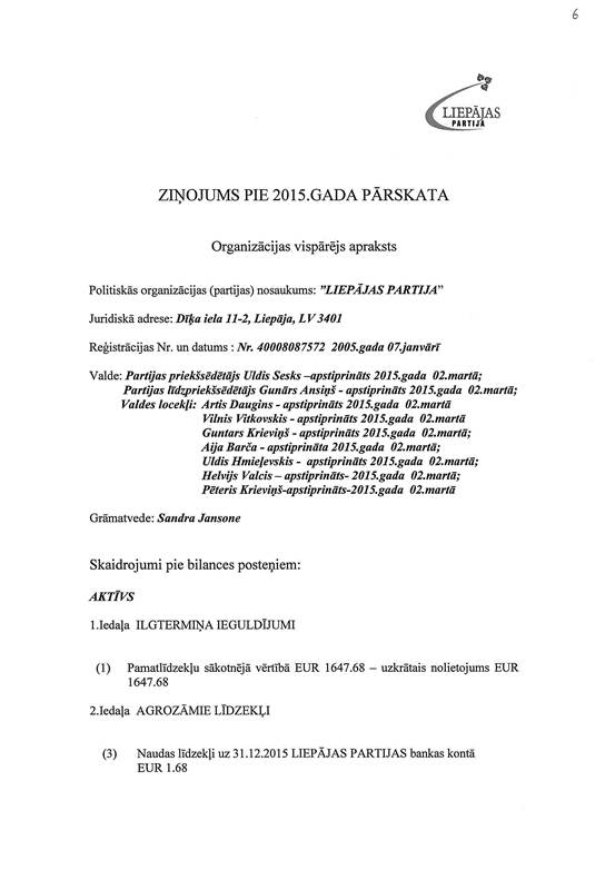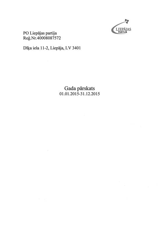 Politiskās partijas "LIEPĀJAS PARTIJA", reģ. Nr. 40008087572, gada pārskats par 2015. gadu