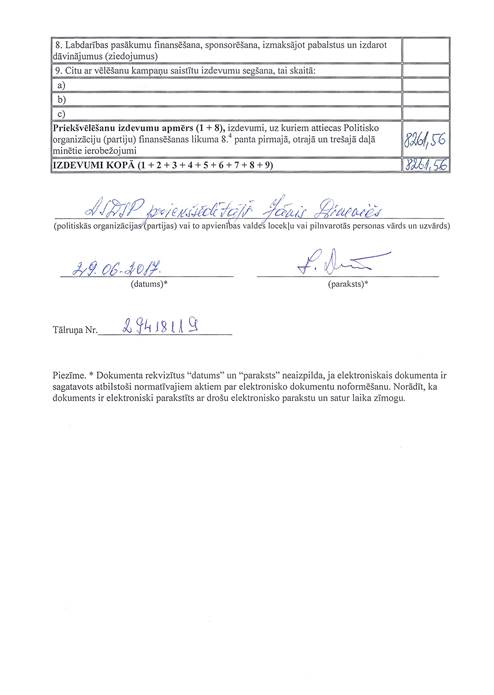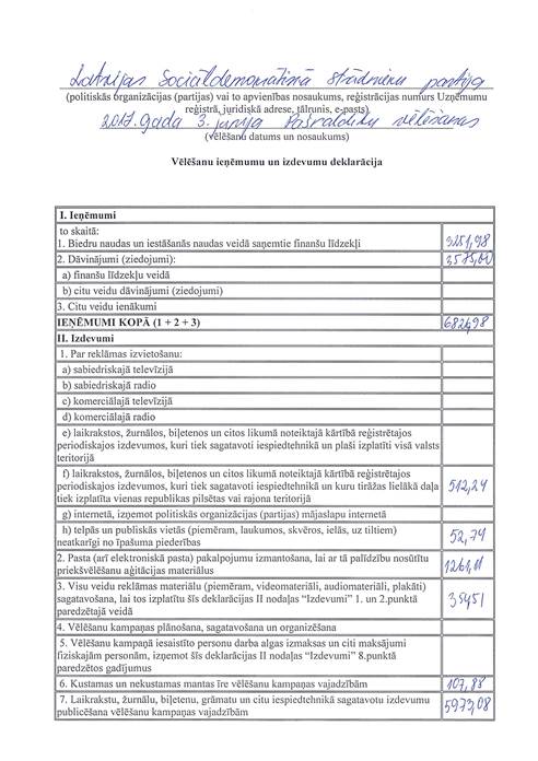 Politiskās partijas "Latvijas Sociāldemokrātiskā strādnieku partija", reģ. Nr. 40008046127, vēlēšanu ieņēmumu un izdevumu deklarācija