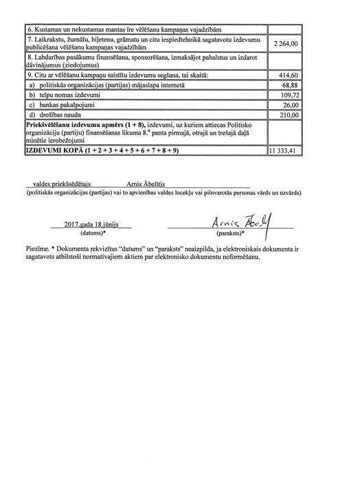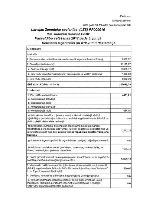 Politiskās partijas "LATVIJAS ZEMNIEKU SAVIENĪBA", reģ. Nr. 40008044840, vēlēšanu ieņēmumu un izdevumu deklarācija