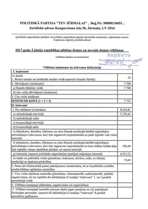 Politiskās partijas "Talsu novada attīstībai", reģ. Nr. 40008202285, vēlēšanu ieņēmumu un izdevumu deklarācija