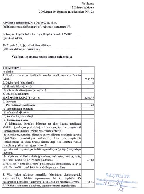 Apvienība Iedzīvotāji, reģ. Nr.40008137854, vēlēšanu ieņēmumu un izdevumu deklarācija