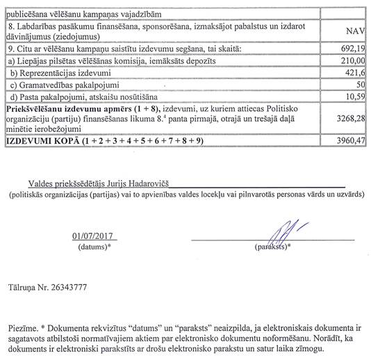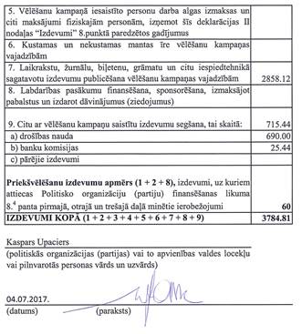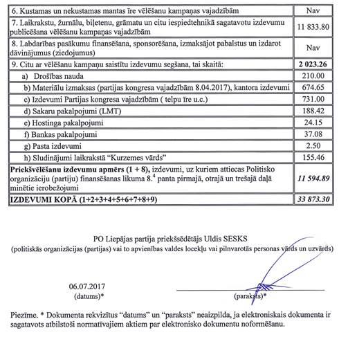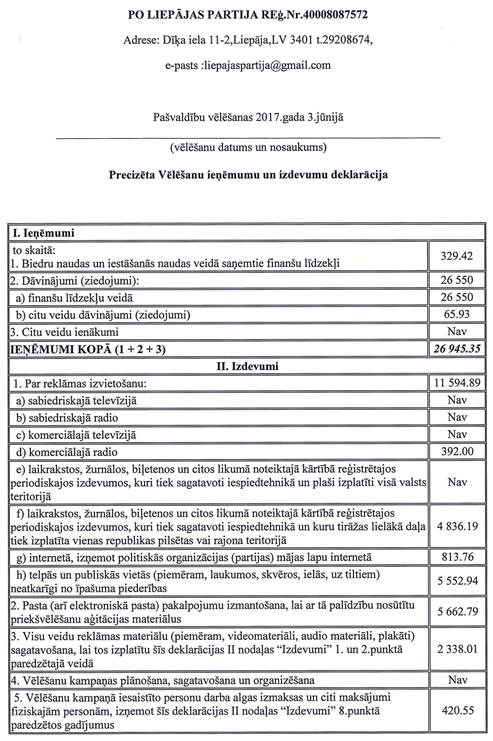PO LIEPĀJAS PARTIJA, reģ. Nr.40008087572, vēlēšanu ieņēmumu un izdevumu deklarācija