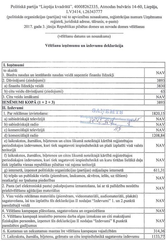 Politiskā partija "Liepāja kvadrātā", reģ. Nr.40008262335, vēlēšanu ieņēmumu un izdevumu deklarācija