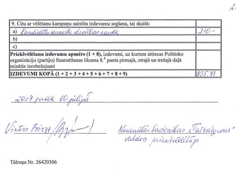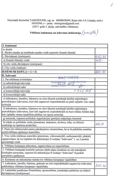 Nacionālā Savienība TAISNĪGUMS, reģ. Nr.40008058499, precizēta vēlēšanu ieņēmumu un izdevumu deklarācija