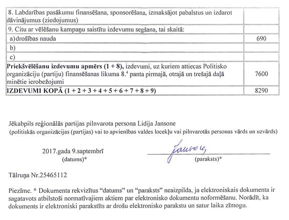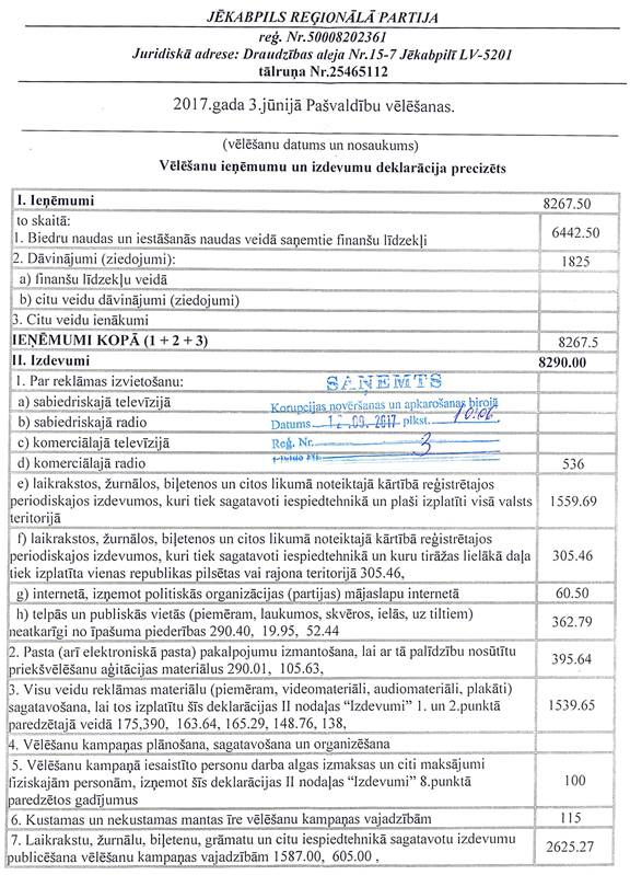 Politiskās partijas "JĒKABPILS REĢIONĀLĀ PARTIJA", reģ. Nr. 50008202361, precizēta vēlēšanu ieņēmumu un izdevumu deklarācija