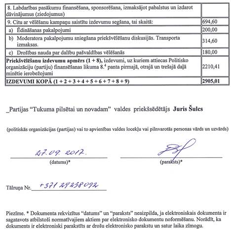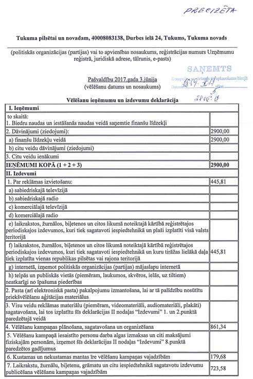 Politiskās partijas "Tukuma pilsētai un novadam", reģ. Nr. 40008083138, precizēta vēlēšanu ieņēmumu un izdevumu deklarācija